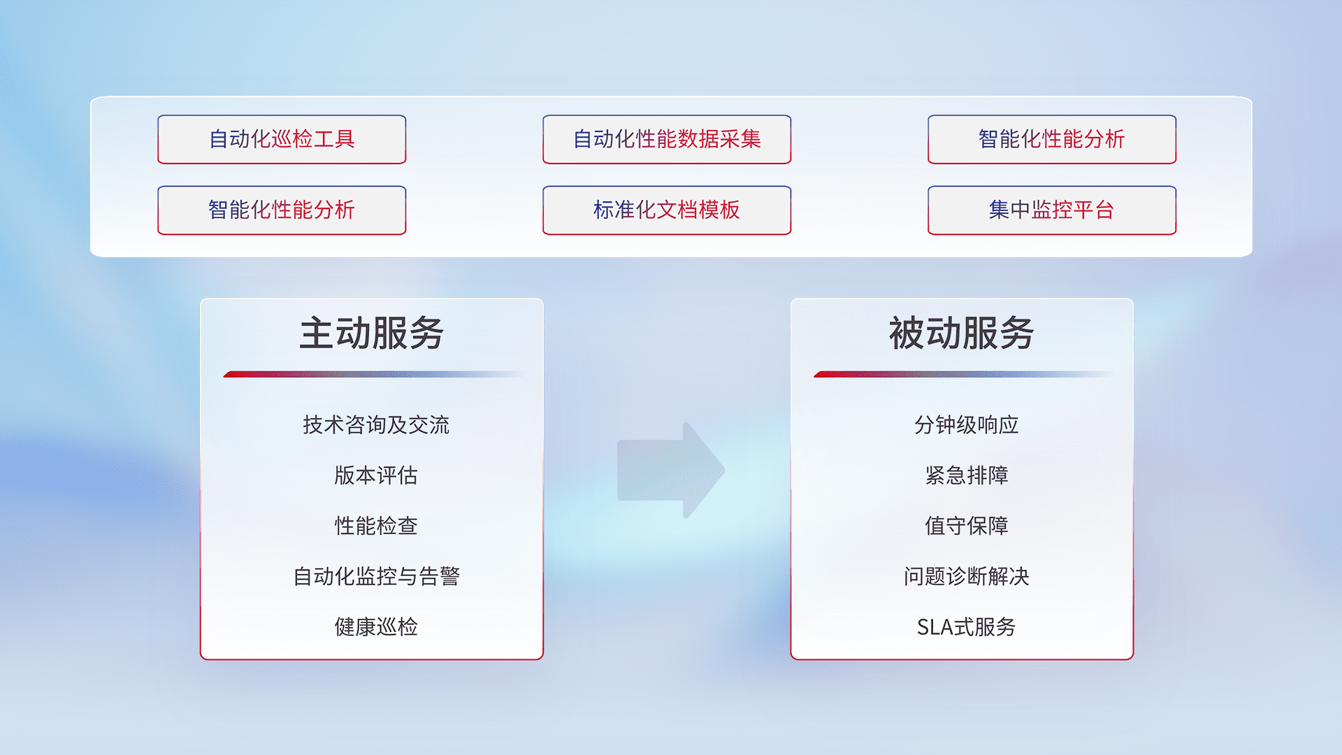智能化工具和标准化文档,,,,保障服务质量,,,,提供主动服务(包含技术咨询、、版本评估、、性能检查、、、、自动化监控与告警、、、健康巡检)和被动服务包含(分钟级响应、、、紧急排障、、值守保障、、问题诊断解决、、、SLA服务)。。。。
